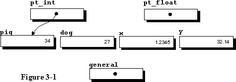 In line 12 the pointer named pt_int is assigned the address of the variable named pig and line 13 uses the pointer named pt_int to add the value of dog to the value of pig because the asterisk dereferences the pointer in exactly the same manner as standard C. Figure 3-1 is a graphical representation of the data space following execution of line 13. Note that a box containing a dot represents a pointer. The address is used to print out the value of the variable pig in line 14 illustrating the use of a pointer with the output stream object cout. Likewise, the pointer to float named pt_float is assigned the address of x, then used in a trivial calculation in line 18.