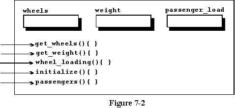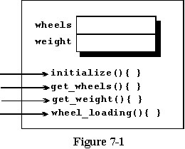 An object of this class will have three of the four methods of vehicle and the two new ones declared here. The method named initialize() which is part of the vehicle class will not be available here because it is hidden by the local version of initialize() which is a part of the car class. The local method will be used if the name is repeated allowing you to customize your new class. Figure 7-2 is a graphical representation of an object of this class.