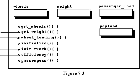 Examine the file named TRUCK.H for an example of another class that uses the vehicle class and adds to it. Of course, it adds different things to it, because it will specialize in those things that pertain to trucks. In fact, it adds two more variables and three more methods. Once again, ignore the keyword public following the colon in line 7 for a few minutes and we will cover it in detail in the next chapter of this tutorial. See figure 7-3 for a graphical representation of the truck class.